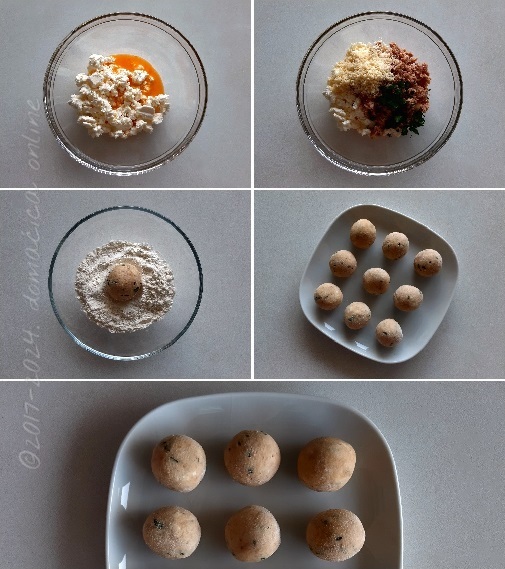 Izmedju dlanova oblikovati kuglice, pa svaku uvaljati u brašno i spustiti na tanjir.